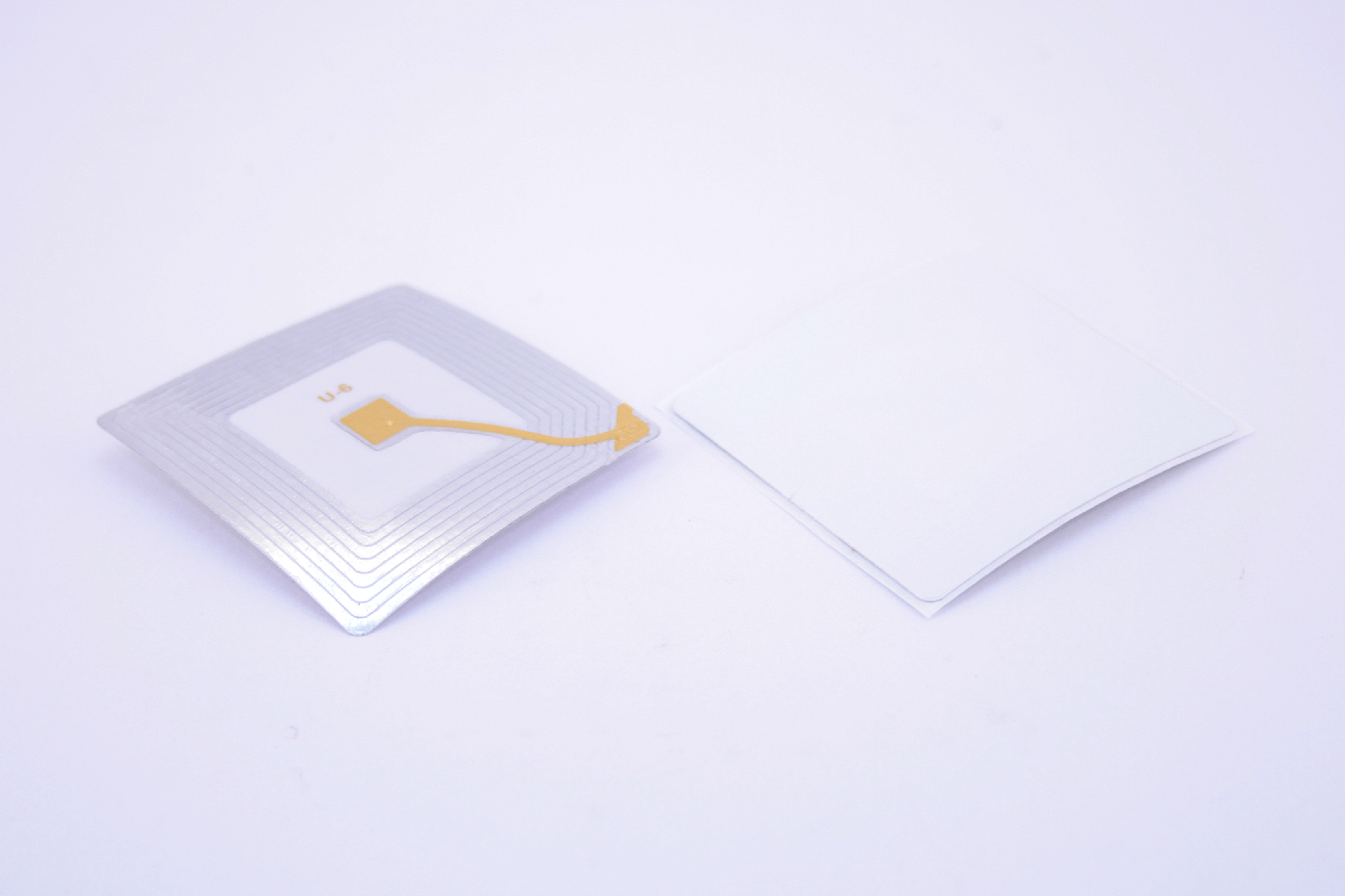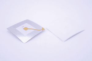 Etiqueta antihurto adhesiva RF 5×5 8,2 Mhz desactivable blanca medidas 50mmx50mm suministrado en rollos de 1000 unidades.